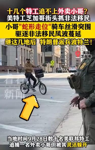 9月28日,在芝加哥的街头,数十名联邦特工在巡逻时锁定了一名骑单车的外卖员。特工们认为这名外卖员“行为可疑”,随即决定实施逮捕。根据现场画面显示,就在特工们即将合围的瞬间,这名外卖小哥展现出了惊人的灵活性和对单车的掌控能力。他在关键时刻灵活躲闪,成功突破了特工的包围圈。有视频报道描述,这是一次“灵活走位”的摆脱,还有媒体形容外卖小哥是“骑车丝滑突围”。
