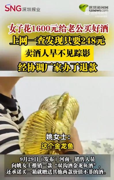 【女子花1600元买酒上网一查仅值248元】“便宜不可能都让你占了。”河南的姚女士的丈夫一句无心之言,却道破了这场消费骗局的真相。9月29日,姚女士在祥符庄园购买白酒时,被销售人员推销了一款名为“双沟酒金龙鱼酒”的产品,对方强调其寓意富贵,并承诺购买一箱就赠送其他两款价值较高的酒。出于对丈夫的关爱,姚女士花费1600元购买了这款外观金光闪闪的白酒。然而回家后,她上网查询惊讶地发现,同款酒在网上仅售248元,价格相差近6倍。
