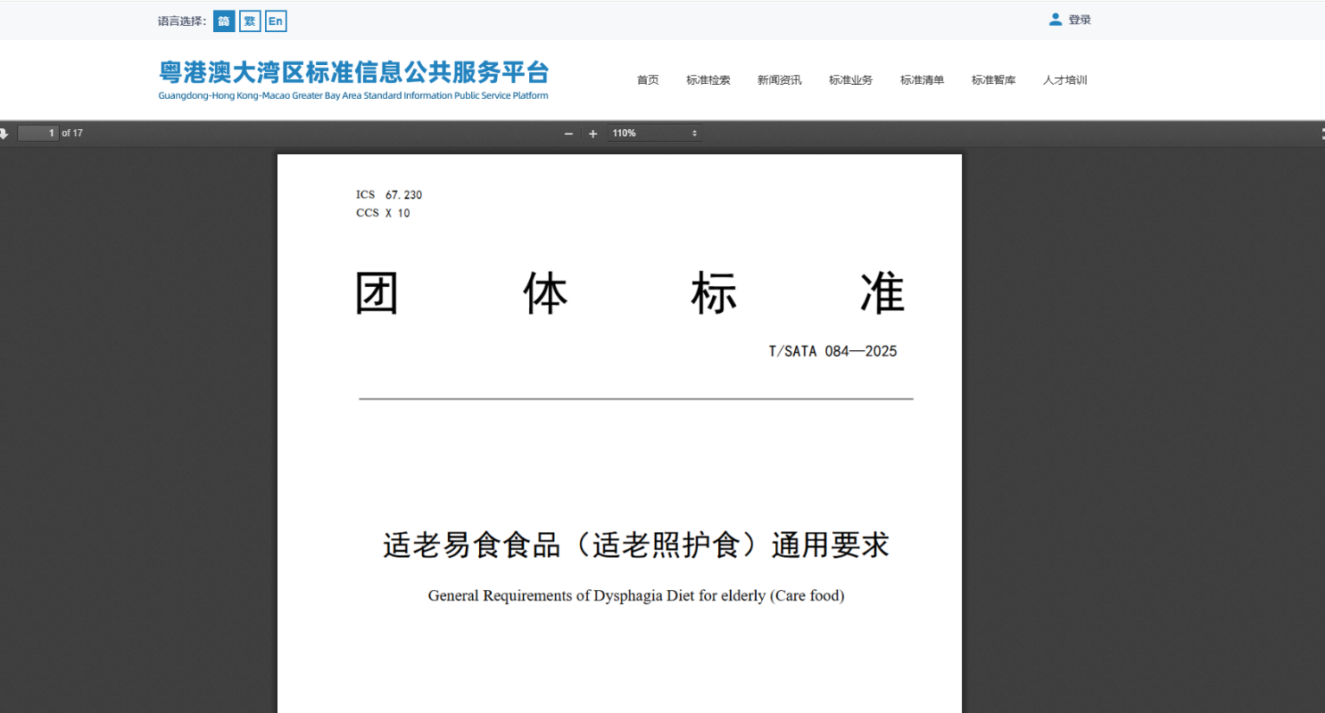 《适老易食食品(适老照护食)通用要求》以国际吞咽障碍饮食标准(IDDSI)为主要参考标准,结合粤港澳地区饮食习惯、产业能力与监管要求,为政府监管、企业生产、机构采购及居家照护提供技术依据,引导适老食品产业规范化及规模化发展,适用于预先包装食品。