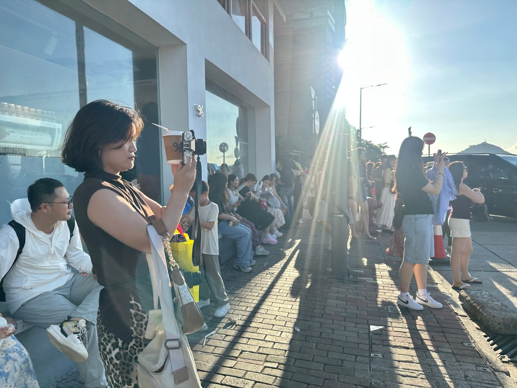 从疫情后开始,小红书等社交媒体流行打卡三件套——落日飞车、坚尼地城咖啡店、摩天轮。其中坚尼地城咖啡店热度未减,傍晚时分一个街口聚满数百人。记者发现,来打卡的都自配专业相机或复古相机,准备多套衣服换著拍。现场甚至有本地的摄影发烧友来拍摄落日下的人像,并免费赠送给游客。