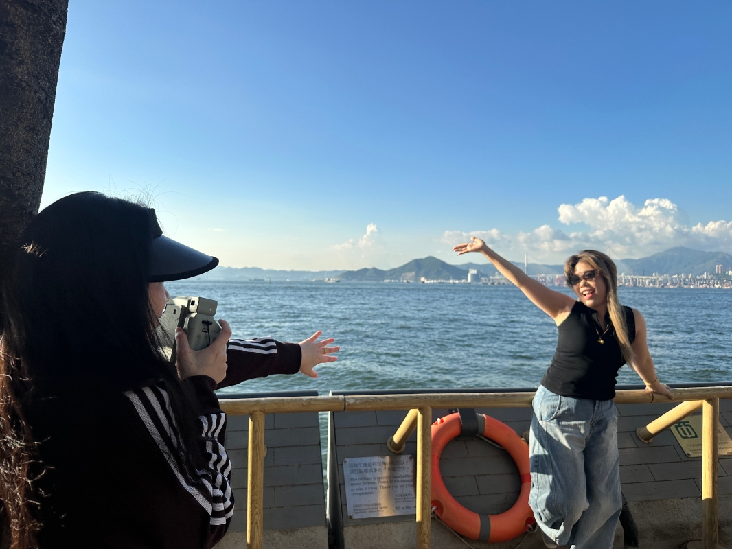 来自珠海的林小姐与闺蜜来了两天,专门空出两个小时在西区海边,用90年代的CCD数码相机耐心拍照。她对记者说“虽然说是网红打卡点,但很值得来,香港的特色地标如青马大桥、路牌都很出片,怎么拍都好看,根本逛不完。”唯一美中不足的是“国庆假期游客实在太多了”。