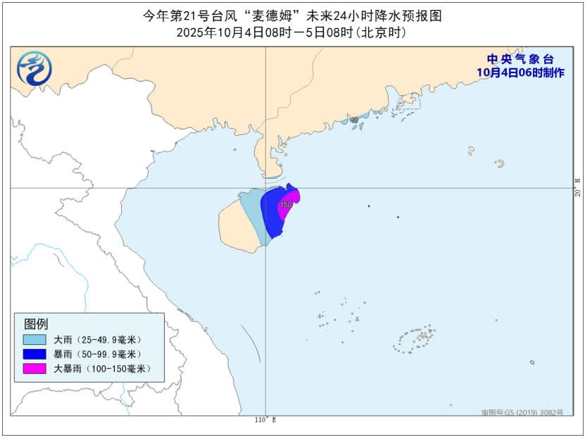 降水预报:4日08时至5日08时,广东西部沿海、海南岛中东部有大到暴雨,其中,海南岛东北部有大暴雨(100-150毫米)。(完)