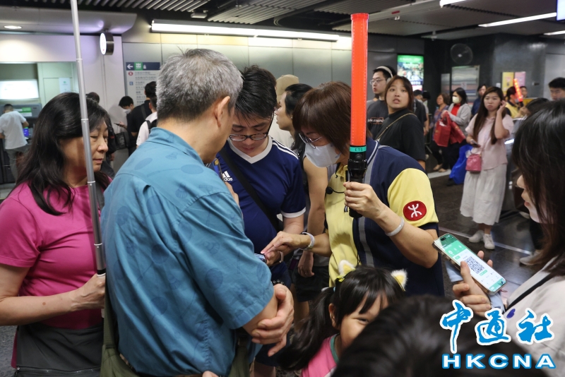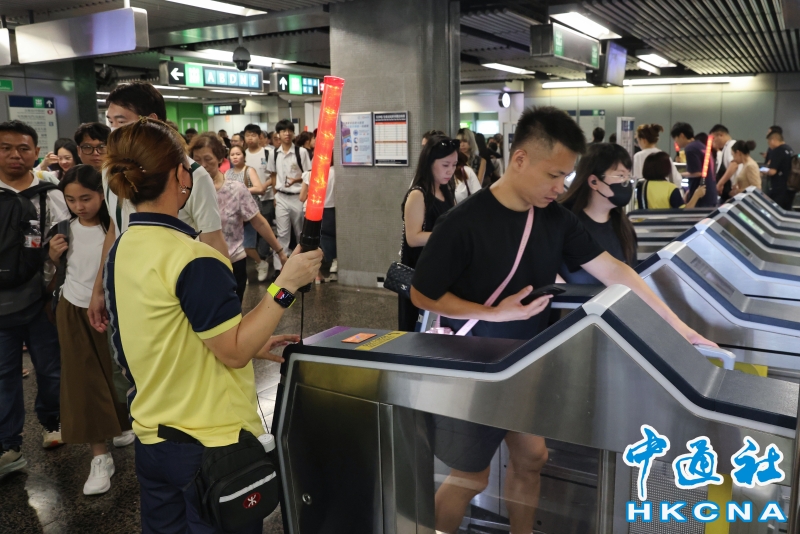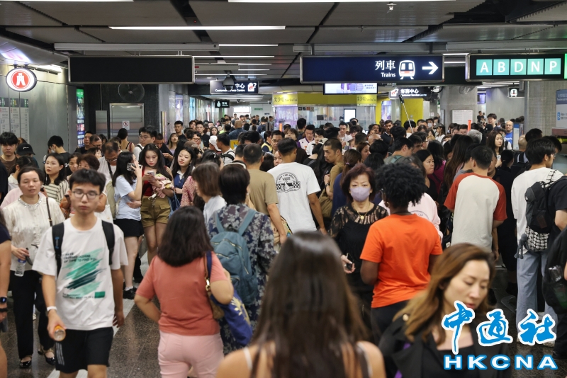 10月3日,香港尖沙咀地铁站人头涌涌,许多工作人员在场维持秩序。内地国庆黄金周和中秋一连8日长假期,香港不少商业场所和旅游景点,游人如织,市道也很畅旺。(香港中通社记者 谢光磊 摄) 香港中通社图片