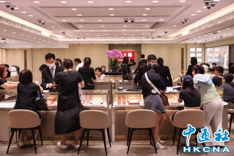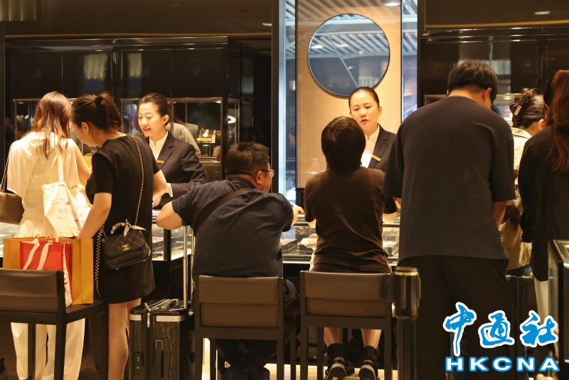 10月3日,香港尖沙咀一间金饰店内,大批顾客在选购金饰。内地国庆黄金周和中秋一连8日长假期,香港不少商业场所和旅游景点,游人如织,市道也很畅旺。(香港中通社记者 谢光磊 摄) 香港中通社图片