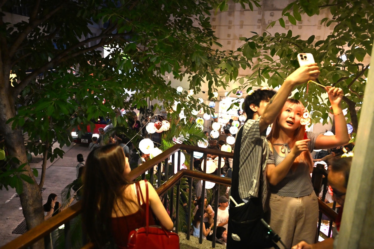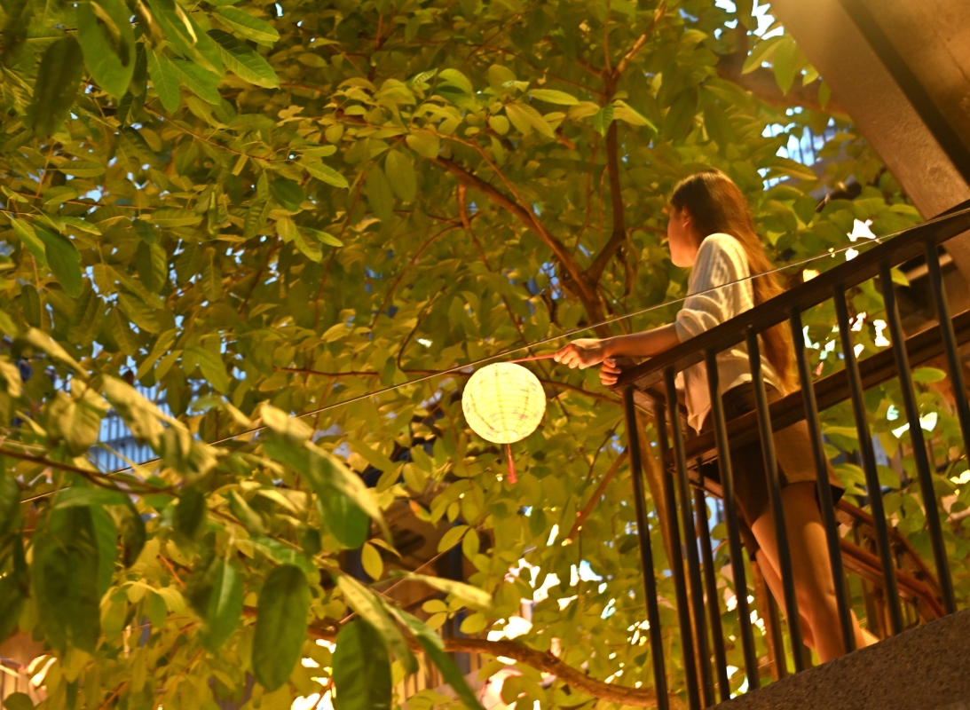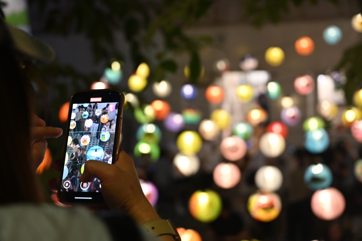“蓝屋”点亮主题为“悦夜月蓝”的彩灯艺术装置,逾700个由香港艺术家和湾仔街坊手绘的花灯,吸引大批市民和游客欣赏和拍照打卡