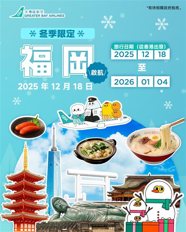香港新闻网10月9日电 大湾区航空在今日(9日)宣布,将于今年12月18日至明年1月4日圣诞新年期间,推出日本九州福冈季节性航班服务,以满足旅客在此旅游旺季的需求。该航线将于上述期间每日提供1班来往香港与福冈的航班。