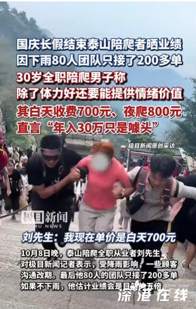 太离谱!泰山陪爬者长假业绩:80人接200单 陪爬男子称“除了体力好还要能提供情绪价值”,直言“年入三十万只是噱头”!