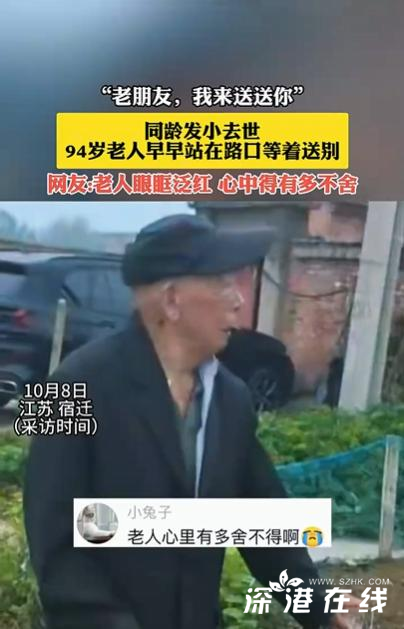 【94岁爷爷早早站在路口送去世发小】2025年10月8日清晨,江苏宿迁的街道尚未完全苏醒,94岁的老人已拄着拐杖,静静站在路口。深秋的凉风吹动他花白的头发,却吹不散他凝望道路尽头的目光——今天,他的发小要出殡了。因腿脚不便无法随送葬队伍同行,老人选择守在这个两人年少时常相聚的路口,用一声“老朋友,我来送送你”,为跨越近一个世纪的友情画下最后的句点。视频画面中,老人身着深灰色西装,内搭白色衬衫,身姿虽不再挺拔,却因那份执着而显得格外庄重。当灵车缓缓驶过时,他微微直起佝偻的背,眼眶泛红,嘴角不受控制地抽动,轻声念叨:“老朋友,我来送送你。”话音未落,泪水已顺着皱纹密布的脸颊滑落。