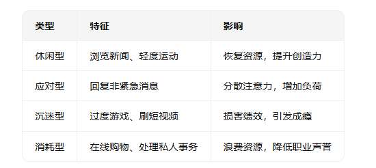 尽管研究证实了摸鱼的必要性,但并非所有摸鱼行为都能产生积极效果。根据行为分类理论,职场摸鱼可分为四类:
