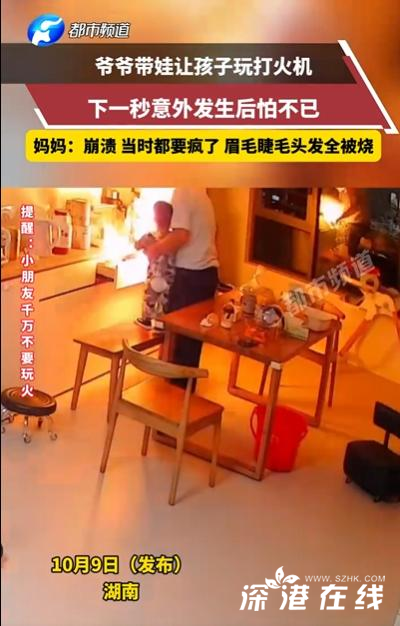 【爷爷带娃玩打火机 下一秒火光冲天】一个普通的打火机,一次不经意的纵容,瞬间燃起的火焰吞噬了孩子的脸庞,也灼烧着一个家庭的未来。“不能让粗心的老人带孩子!”这是事件视频传开后,一位网友的感慨。10月9日,湖南一位爷爷在家带孩子时,竟将打火机当作玩具递给了孩子。下一秒,意外发生——打火机突然窜出巨大的火苗,孩子的眉毛、睫毛、头发全部被点着,脸上的皮肤也被烧伤。这起令人痛心的事件,不仅是一个家庭的不幸,更再次敲响了儿童安全的警钟。部分老人带孩子时安全意识比较浅薄,考虑问题不全面,他们往往会将危险物品给孩子玩,酿成的悲剧不计其数。