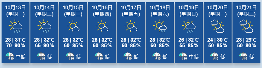 香港新闻网10月12日电 从艶阳高照到突降大雨,香港的天气说变就变。香港天文台指过去两三小时,本港多处地区录得约10毫米雨量。本港地区下午及今晚天气预测大致多云,有几阵骤雨。未来一两日仍有几阵骤雨,短暂时间有阳光。本周中至后期大致天晴及炎热。