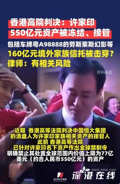 【许家印车牌粤A98888劳斯莱斯被接管】车牌“粤A98888”的劳斯莱斯幻影和“HD3333”的另一辆豪车,如今已成为许家印家族77亿美元资产被香港法院接管的标志性符号。2025年10月11日,香港特别行政区高等法院作出一项重要判决,授权中国恒大集团的清盘人正式接管许家印家族价值高达77亿美元(约合人民币550亿元)的资产。这批资产包括位于中国香港、英国和美国的多处物业、私人飞机、游艇以及两辆引人注目的劳斯莱斯幻影。其中一辆劳斯莱斯挂着内地车牌“粤A98888”,另一辆则挂着香港车牌“HD3333”——这个数字恰好对应了中国恒大曾经的证券代码。这些曾经象征着财富与地位的奢侈品,如今成了恒大清盘进程中的资产清单上的普通项目。