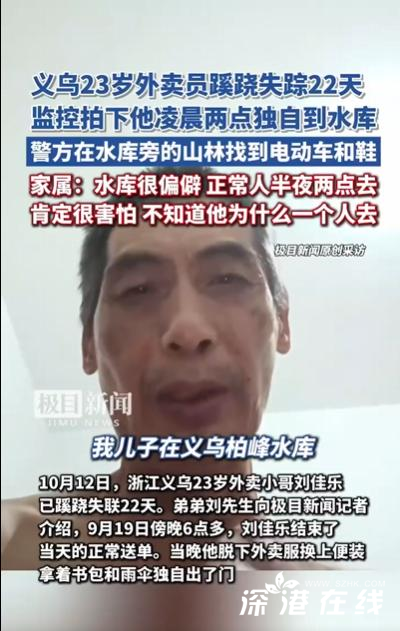 【浙江23岁外卖小哥蹊跷失踪22天】刘佳乐的电动车和鞋子在水库边被发现,人却如同人间蒸发,留给家人的是无尽等待与未解谜团。10月12日,浙江义乌23岁外卖小哥刘佳乐已蹊跷失联22天。9月20日凌晨,他最后被拍到骑车前往一个水库,此后人间蒸发。在水库附近的山林里,警方找到了他歪倒的电动车和鞋子,却不见人影。这个离他住处二十多公里的偏僻水库,为何成为他深夜前行的目的地,成为难解之谜。