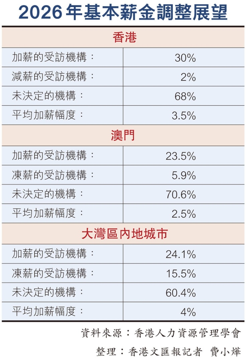 展望来年,分别有30%、23.5%及24.1%香港、澳门及大湾区内地城市的受访机构打算为雇员加薪,湾区内地城市的平均加幅最高达4%,香港则为3.5%,澳门为2.5%(见表)。