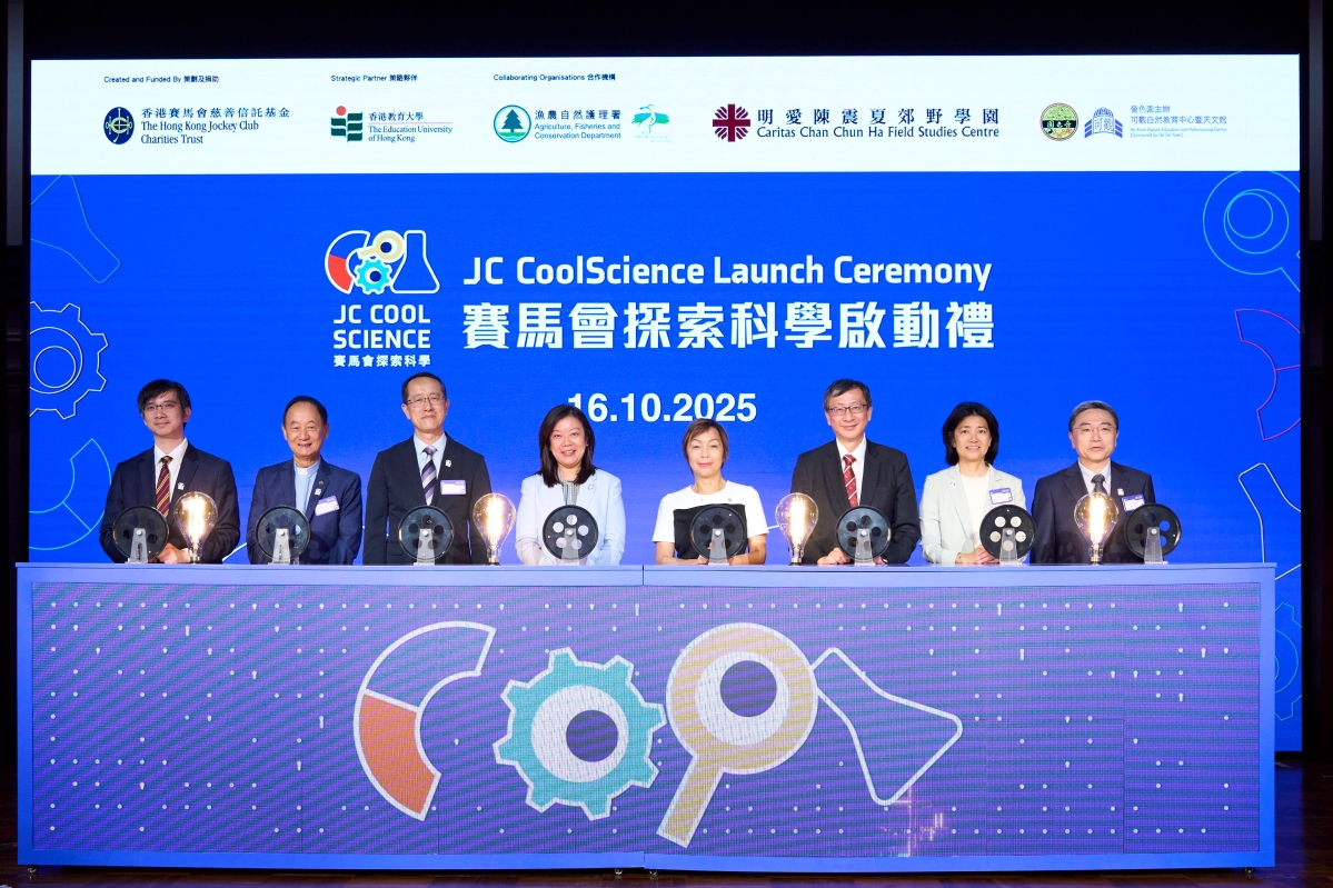 香港特区政府教育局常任秘书长陈颖韶(左四)、香港赛马会董事龚杨恩慈(右四)、香港教育大学校长及课程与教学讲座教授李子建(右三)、香港特区政府渔农自然护理署署理署长黎存志(左三)、“赛马会探索科学”计划咨询委员会召集人梁颕宇(右二)、北京师范大学科学教育研究院院长郑永和(右一)、香港明爱总裁阎德龙(左二)及啬色园董事会副主席兼教育委员会主席姚嘉栋(左一)为“赛马会探索科学”计划主持启动礼。