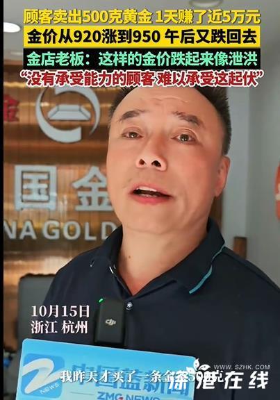 【金店老板:金价跌起来像泄洪】10月15日,浙江杭州。顾客卖出500克黄金,1天赚了近5万元。14日,金价从920涨到950,午后又跌回去。金店老板:这样的金价跌起来像泄洪。“没有承受能力的顾客难以承受这起伏”。老板表示,我昨天才买一条金条500克,100块钱一克,这名顾客差不多赚了5万块钱。有时候像这样的金价,跌起来也是泄洪一样。昨天一天这个时候金价是920多,到12点的时候950多,12点之后一下子就成了920了,跟过山车一样。有经济压力的人是承受不了这个风浪的。10月15日,品牌金饰最高1235元/克,40年的杭州黄金回收商感叹:普通人一个月工资只能买3克黄金。现在年轻人结婚只能租黄金戴戴,戴几天再还回去!