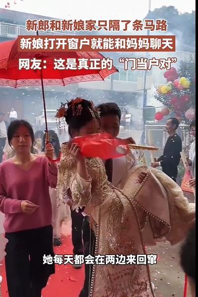 【新郎新娘家只隔条马路 2人7岁就相识】近日,安徽六安一场特殊婚礼引发网络热议——新郎盛先生与新娘自幼对门而居,两家直线距离不足40米,这段跨越马路的"真·青梅竹马"恋情,被网友称为现实版"门当户对"的完美诠释。据知情人士透露,这对新人自幼相识,经过五年恋爱长跑后修成正果。婚礼现场,两家仅隔一条马路的特殊地理位置,让传统婚俗呈现出别样温情:按照当地习俗,新娘新婚前两日不得回娘家,思母心切的她选择坐在新郎家窗边,与马路对面的母亲隔街对话。这一幕被宾客拍下后迅速走红,#新娘在婆家开窗就能喊妈#的话题阅读量突破2亿次。新郎盛先生在接受采访时笑称,这种距离优势完美解决了"春节去谁家过年"的世纪难题,"步行两分钟就能兼顾双方父母"。婚礼策划师透露,迎亲环节特别设计了"隔街抛花球"的创意环节,新娘站在自家阳台将手捧花抛向马路对面的亲友群,引发阵阵欢呼。社会学家指出,这种"40米婚姻"折射出当代年轻人对新型家庭关系的探索。既保持独立小家庭的完整性,又能随时维系与原生家庭的亲情联结。网友评论称:"这才是真正的'一碗汤距离',比那些刻意追求的'周末父母'更显温情。"据悉,这对新人计划婚后继续保持"对门而居"的生活模式,双方父母已协商好轮流帮忙照料家务。婚礼跟拍摄影师表示,抓拍到的许多温馨画面都源于这种特殊距离:比如新娘透过窗户给母亲送自己包的饺子,新郎陪父亲下棋时能随时听到岳母在阳台的招呼声。