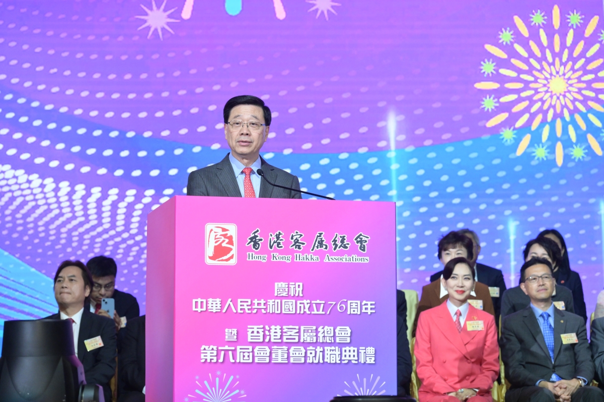 香港特区行政长官出席庆祝中华人民共和国成立76周年暨香港客属总会第六届会董会就职典礼致辞。图源:行政长官办公室