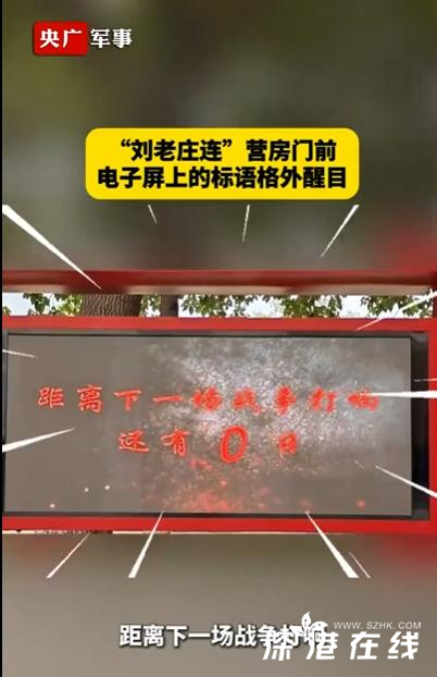 【“距离下一场战争打响还有0日”】“刘老庄连”营房门前,电子屏上滚动的标语没有数字倒数,只有醒目的“0日”。这一行字,诠释着中国军队时刻准备冲锋的状态。“0日,意味着时刻准备、步履不停,意味着我们时刻都在冲锋的路上。”“刘老庄连”政治指导员戴天骄这样诠释电子屏上的标语。这块电子屏位于“刘老庄连”营房门前,上面显示的“距离下一场战争打响还有0日”标语格外醒目,它不仅是一个警示,更是中国军队练兵备战的日常写照。
