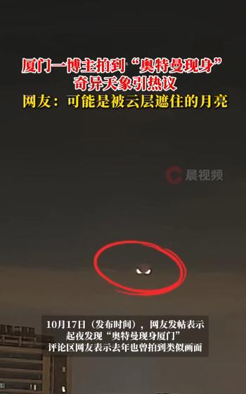 【厦门一博主拍到“奥特曼现身”】云层中浮现的巨大身影,双眼炯炯发光,轮廓分明——这不是特效电影,而是厦门夜空出现的奇异景象。2025年10月17日,厦门一位网友发帖称起夜时意外发现夜空中有“奥特曼现身”,并附上了拍摄画面。该视频迅速在网络上引发热议,有网友表示自己在去年也曾拍到过类似画面。