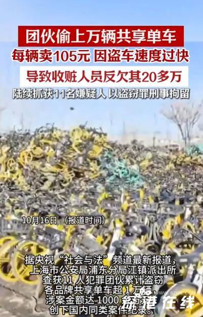【男子偷上万辆共享单车 每辆卖105元】共享单车一夜之间集体“蒸发”,GPS信号定格在五十公里外的荒地,一场规模庞大的盗窃案浮出水面。上海市浦东新区江镇派出所2023年6月1日接到一起报警,某共享单车公司负责人称140余辆共享单车一夜之间原地消失。 停止“心跳”的单车却莫名出现在五十公里之外。警方经过调查,揭开了这起规模庞大的共享单车盗窃案。一个11人犯罪团伙累计盗窃各品牌共享单车超1万辆,涉案金额达1000余万元,创下国内同类案件纪录。