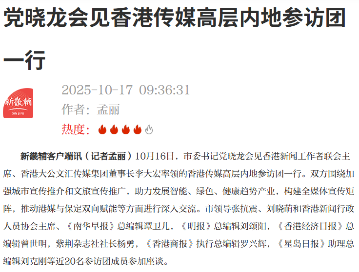 《保定日报》报道,双方围绕加强城市宣传推介和文旅宣传推广,助力发展智能、绿色、健康趋势产业,构建全媒体宣传矩阵,推动港媒与保定双向赋能等方面进行深入交流。市领导张抗震、刘晓萌和香港新闻行政人员协会主席、《南华早报》总编辑谭卫儿,《明报》总编辑刘颂阳,《香港经济日报》总编辑曾世明,紫荆杂志社社长杨勇,《香港商报》执行总编辑罗兴辉,《星岛日报》助理总编辑刘克刚等近20名参访团成员参加座谈。(完)