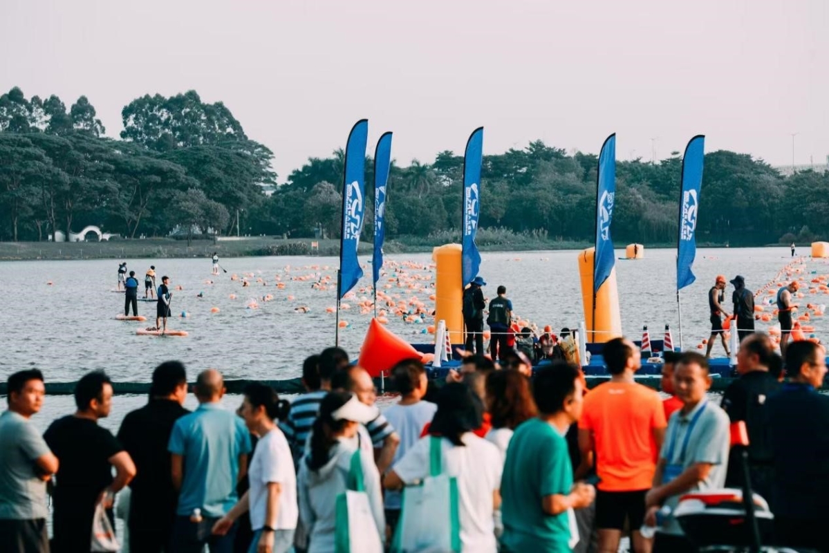 赛事全面对标国际标准,赛道设计、安全保障、补给服务等细节精益求精。赛事设置全程、半程及青少年体验组三个组别,覆盖从精英选手到新秀的多元需求。赛事选址广州中心城区最大人工湖——白云湖西湖,依托1230亩生态湖区与3公里环湖绿道,打造“移动的风景大片”式赛道,是白云区“一区一品牌”体育赛事的重要承载。作为广州的“城市绿肺”,整场赛事路线巧妙串联起清代古水闸、桃花岛、波斯菊花海等特色景观,选手穿行期间,在这座兼具专业性与观赏性的城市赛场上完成游泳、骑行、跑步三重挑战