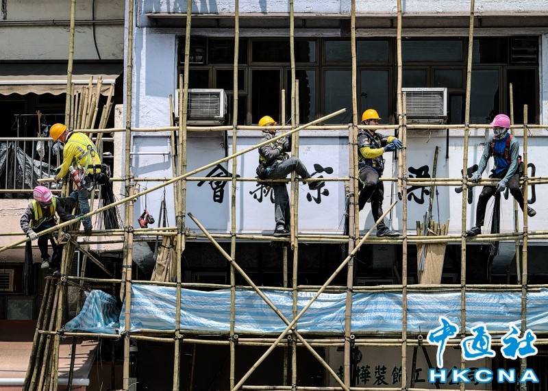 图为搭棚工人在高空中工作 (香港中通社记者 徐文峰摄)