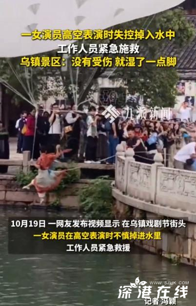 【女演员高空表演时不慎落水 乌镇回应】2025 年 10 月 19 日,浙江嘉兴乌镇西栅景区,一名女演员在表演 “扶摇飞天” 时,因风力过大导致气球失控,从高空坠入湖中,现场游客惊呼声四起!“气球突然被风吹歪,演员直接掉进了水里!” 目击游客桑女士描述道。2025 年 10 月 19 日,乌镇西栅景区内,一名女演员在表演高空节目时发生意外,失控落入湖中。现场工作人员迅速展开救援,将演员拉回岸边。景区随后回应称,事故原因为大风天气导致气球失控,女演员仅脚部打湿,未受伤。