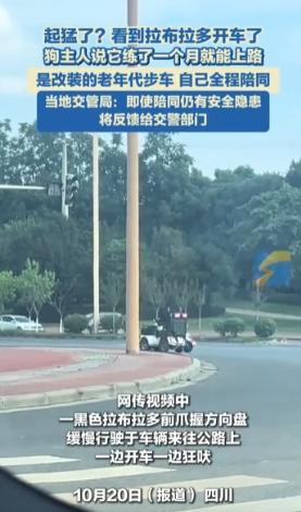 【拉布拉多开车上路?当地交管局回应】一只黑色的拉布拉多犬,坐在改装过的老年代步车里,前爪搭着方向盘,在车辆来往的公共道路上缓慢行驶 —— 这令人难以置信的一幕,近日在四川眉山真实上演。“出现幻觉了看到狗子开车!”2025 年 10 月 18 日,四川眉山一位网友在公路上拍到了一段令人瞠目结舌的视频:一只黑色的拉布拉多犬独自驾驶着一辆电动车,一边开车还一边 “狂吠”。视频迅速在网络上传播,引发广泛关注和热议。10 月 19 日,记者联系上了狗主人陈先生。他表示,这只拉布拉多在当地是个 “网红”,今年五岁,已经学会了滑滑板、开灯、扔垃圾等多种技能,练车仅一个月就已经能够上路行驶。