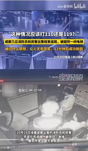 【消防员和民警凌晨被困同一电梯】电梯显示屏上的数字静止不动,狭小空间里,几位刚刚完成救援任务的消防员和民警面面相觑 —— 这一次,他们从救援者变成了需要被救援的人。​“这种情况应该打 110 还是 119?” 这个平日里听起来像段子的问题,在 10 月 20 日凌晨的成都变成了现实。几位刚出警结束的消防员和民警,在返程时竟被同时困在同一部电梯里,这场突如其来的尴尬遭遇,随后在网络上引发广泛关注。​
