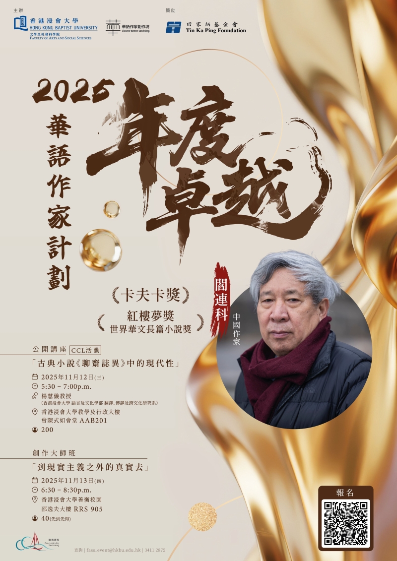 在今届“2025年度卓越华语作家系列”活动中,阎先生将于11月12日主讲题为“古典小说《聊斋志异》中的现代性”的公开讲座,分享创作小说的历程与心得;并于11月13日主持名为“到现实主义之外的真实去”的写作大师班,与学员分析如何建立小说的内容。(完)