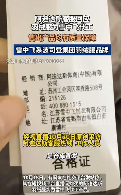 【阿迪达斯羽绒服竟是雪中飞代工的】一件标价 869 元的阿迪达斯羽绒服,水洗标上却清晰印着 “制造商:江苏雪中飞制衣有限公司”—— 这个发现让消费者恍然大悟,原来自己花钱买到的国际品牌产品,竟出自一家本土代工厂。“阿迪达斯羽绒服竟是雪中飞代工的”—— 这则话题于 2025 年 10 月 21 日登上百度热搜,引发广泛关注。事件的起因是有网友在社交平台发帖称,其在短视频平台直播间购买的阿迪达斯羽绒服实为雪中飞代工产品。10 月 20 日,记者就此事致电阿迪达斯服务热线,工作人员回应称,具体产品是否代工及代工厂信息门店并不掌握,所有商品均由仓库直发,以实际出货为准。对于品牌溢价问题,该工作人员表示无法回应。
