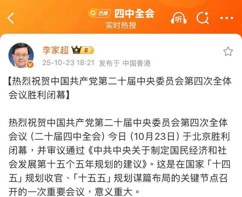 香港中通社10月23日电 中国共产党第二十届中央委员会第四次全体会议23日于北京闭幕,审议并通过《中共中央关于制定国民经济和社会发展第十五个五年规划的建议》。香港特区行政长官李家超发文祝贺二十届四中全会胜利闭幕,表示这是在国家“十四五”规划收官、“十五五”规划谋篇布局的关键节点召开的一次重要会议,意义重大。