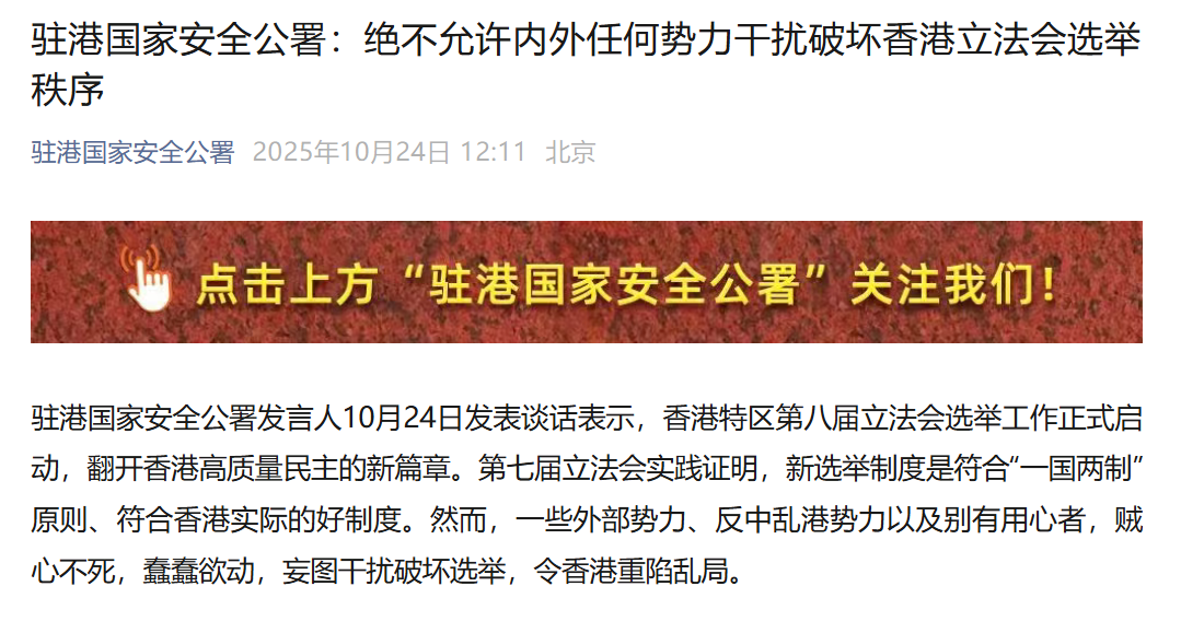 香港新闻网10月24日电 驻港国家安全公署发言人10月24日发表谈话表示,香港特区第八届立法会选举工作正式启动,翻开香港高质量民主的新篇章。第七届立法会实践证明,新选举制度是符合“一国两制”原则、符合香港实际的好制度。然而,一些外部势力、反中乱港势力以及别有用心者,贼心不死,蠢蠢欲动,妄图干扰破坏选举,令香港重陷乱局。