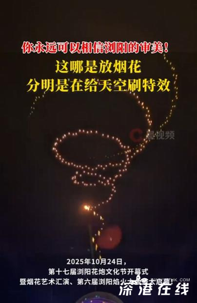 【这哪是放烟花 明明是在给天空刷特效】夜空为幕,烟花作笔,160 米高的 “生命之树” 在夜空中绽放,金色光芒如瀑布般倾泻而下 —— 这场发生在湖南浏阳的视觉盛宴,让无数网友惊叹:“这哪是放烟花,分明是在给天空刷特效!”10 月 24 日至 25 日,第十七届浏阳花炮文化节开幕式暨烟花艺术汇演在浏阳天空剧院举行。融合无人机、音乐与数字技术的烟花表演,以其颠覆传统的创意和震撼的视觉效果,迅速在网络上引发热议。这场以 “光年之约” 为主题的表演,通过五个篇章的精心编排,将烟花的瞬时美学与科技艺术完美结合,展现了传统花炮产业的创新蜕变。