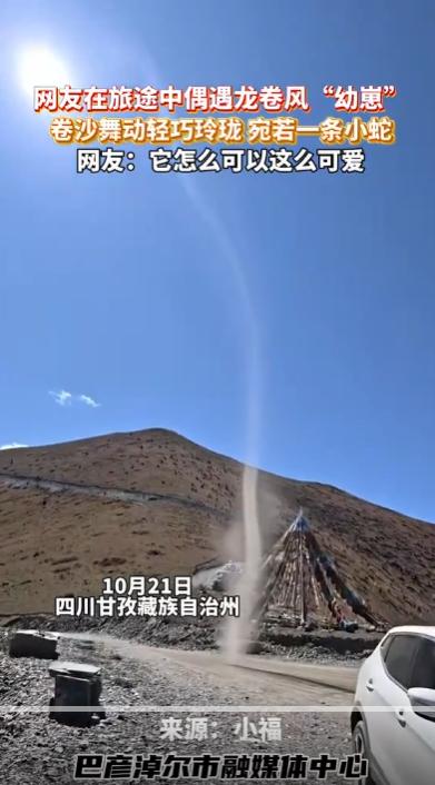 在大多数人认知里,龙卷风是那种遮天蔽日、摧毁一切的巨大风柱。然而这段视频完全颠覆了人们的想象。画面中,一道纤细的风柱在沙地上缓缓移动,高度不足数米,仿佛一个刚刚学会走路的孩子,步履蹒跚却充满活力。它卷起的沙尘在周围形成了一道薄薄的纱裙,整体造型优雅灵动,宛如一条在沙漠中游走的小蛇。这个龙卷风 “幼崽” 与成熟龙卷风的巨大反差,正是它引发如此多关注的原因。​