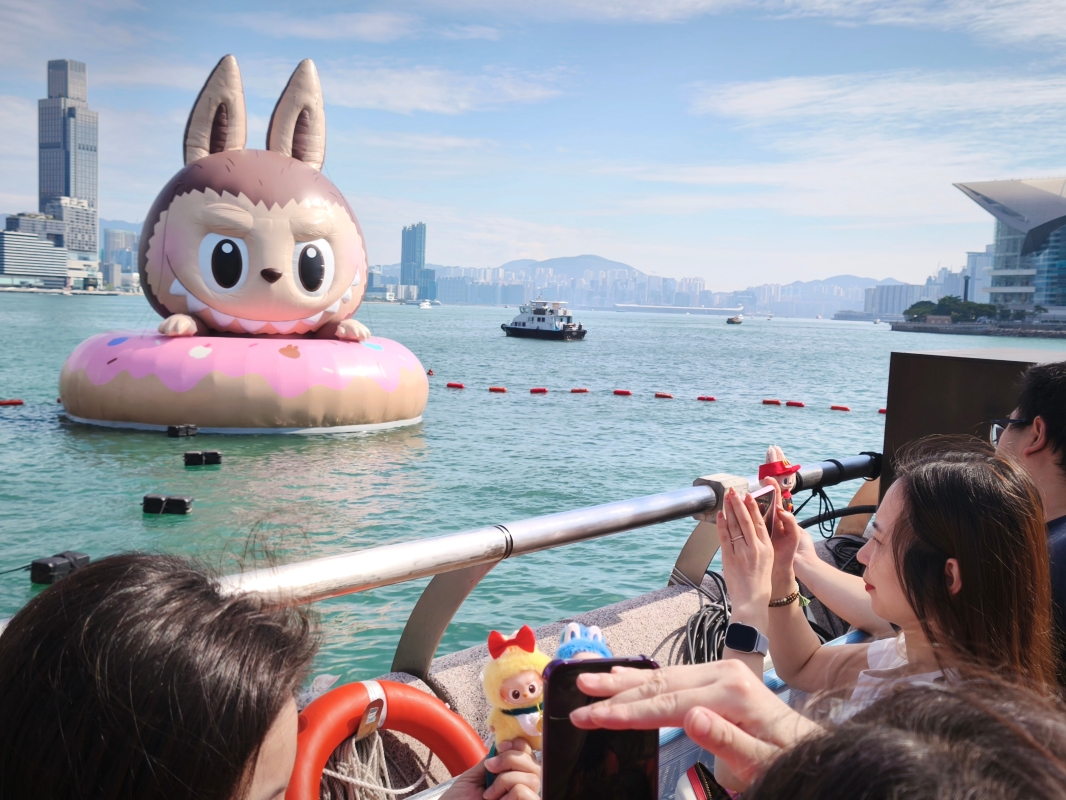 香港新闻网10月26日电(记者洪少葵)10月26日,巨型海上充气雕塑公仔成为市民与游客争相“打卡”之处。不少市民带同自己喜欢的玩偶拍照留影。“维港海上大巡游”活动25日起亮相香港金钟添马公园海滨,4个巨型充气公仔包括多啦A梦、KAWS & 芝麻街(Elmo)、滑嘟嘟及LABUBU在维港展出,并于下月1日举行“海上大巡游”。