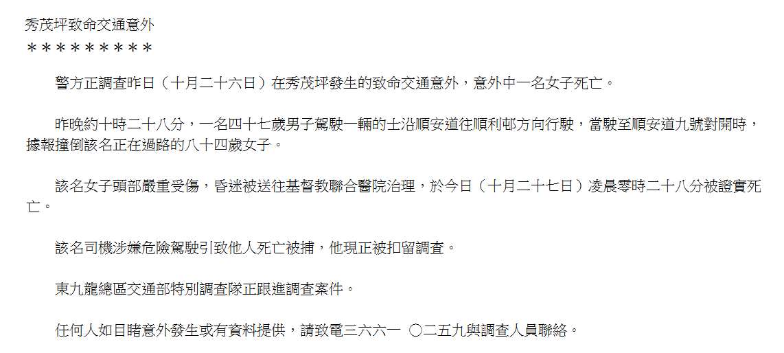 香港新闻网10月27日电 香港警方27日公布,正调查26日晚在秀茂坪发生的致命交通意外,意外中一名女子死亡。