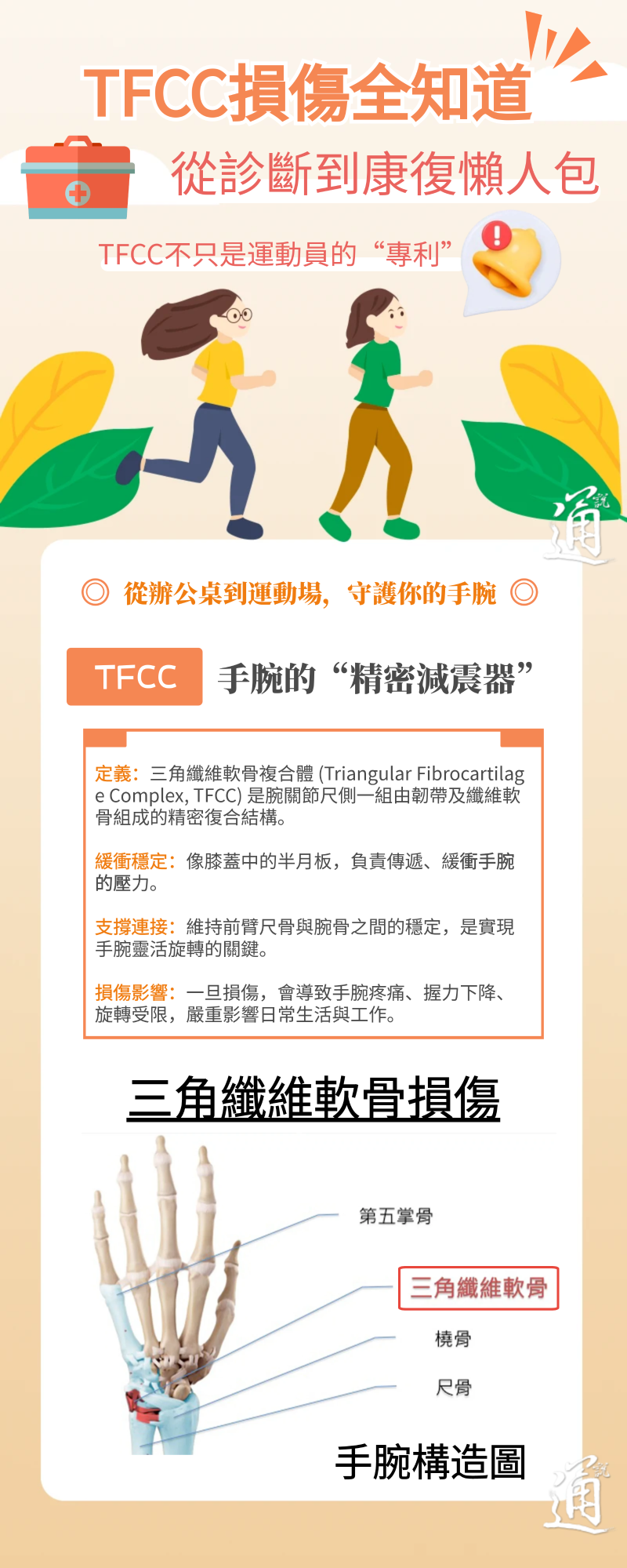 如果你常感到手腕小拇指侧酸胀、疼痛、旋转手腕或按压桌面时无力,这可能就是TFCC发出的警报。香港新闻网近期咨询北京大学深圳医院孟繁斌医生,并为读者制作“TFCC损伤全知道”懒人包,从办公桌到运动场,守护你的手腕。(香港新闻网制图)