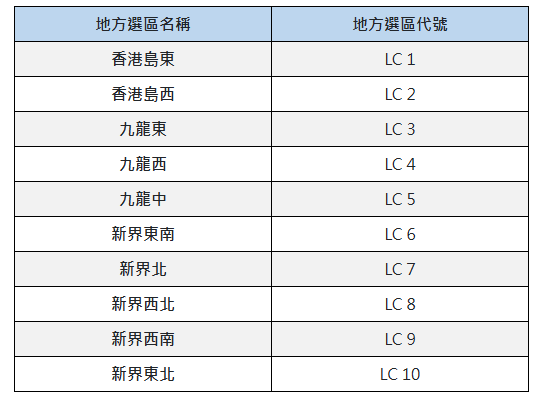 地方选区方面,共设10个地方选区,每个选区产生2名议员。10个地方选区如下: