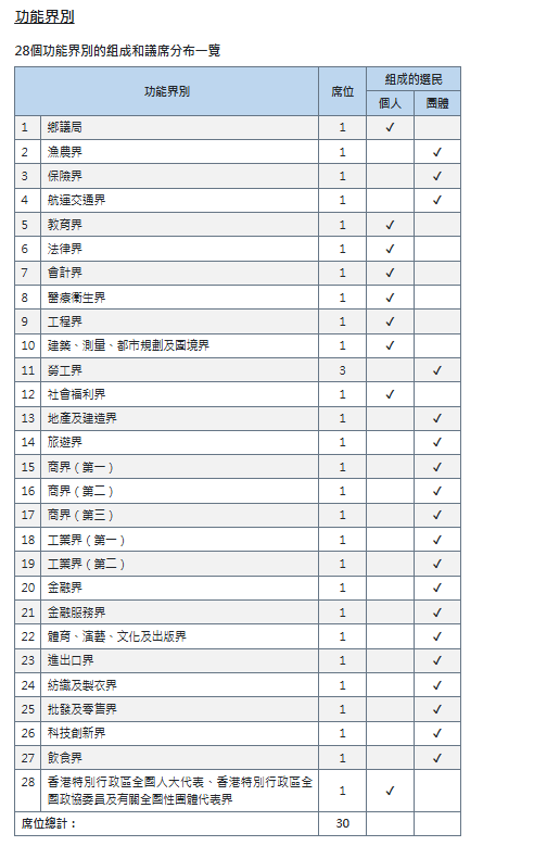 功能界别的构成和议席分布为: