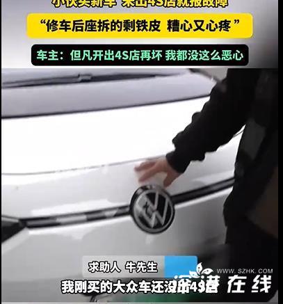 【小伙买新车未出4S店就报故障】10月24日,河南一男子新买的汽车还没开出4S店就出现故障。维修后后座被拆得只剩铁皮,让车主既糟心又心疼。他表示:“要是出了4S店再坏,我都没这么恶心。”牛先生在某大众4S店提了这辆车,但是车辆没有出门就发生了故障;牛先生称当时坐在车辆就发现了故障码,车子还开不了网,没办法开。但是销售让牛先生开走,开两天试试看;牛先生认为车子没啥问题于是开走了;然而开了两天车辆还是无法联网,故障码也没有消除。于是在10月2日去门店检测。检测结果是“在线通讯模块”损坏,解决方案是更换一个新的;只是配件需要从厂家发货,结果拖到10月12日左右才进行维修。牛先生认为在更换该模块的时候,售后把后排座椅全拆了,拆到后排只剩个“铁皮;”这让牛先生感觉很糟心,也非常的心疼。但是售后人员又不管不问。牛先生随即说“你给我稍微有一点点补偿,我就可以(接受)。毕竟是新车,对不对?搁谁心里边,谁都不舒服。”家用汽车产品在保修期内因质量问题,单次修理时间超过5日(包括等待修理零部件时间)的,修理者应当自第六日起为消费者提供备用车,或者向消费者支付合理的交通费用补偿。经营者与消费者另有约定的,按照约定的方式补偿。在牛先生的案例中,如果牛先生将车辆停放在4S店售后进行维修;那么牛先生则应该从第六日起获得对应补偿,但是问题出在牛先生并非是将车辆一直停放在售后,期间是将车辆开走的,于是时间轴就断了,客观事实是不符合补偿的标准。