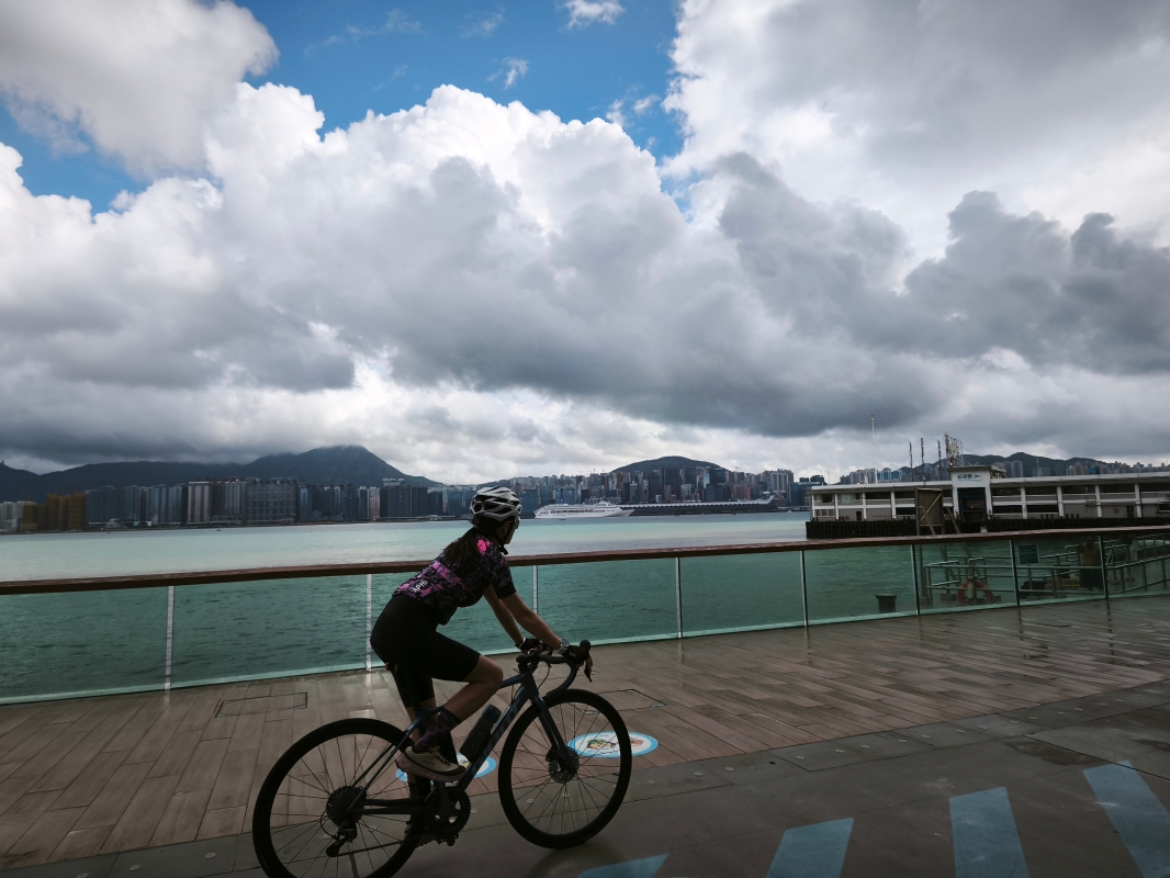 市民在即将举办铁人三项赛事的中环海滨骑单车