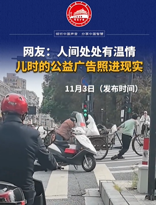 【儿时的公益广告照进现实】11月4日消息,一大叔拉一车废品艰难上坡,热心群众主动帮忙推车,如同儿时公益广告《善行无迹》中的温情场景照进现实,如今路人推车、学生助老、大学生买饭等陌生人互助已成日常温情。据视频可见,一大叔骑着三轮车,满载这纸皮和塑料罐路过一红绿灯路口,而这恰巧是上坡,大叔十分艰难踩着上坡,但力气不够导致三轮车溜坡,旁边的一骑车的市民见状立刻下车。不得不说,想到在少儿频道放公益广告的人简直就是天才,一网友表示“我没变成坏人,就是当年看了这些”,譬如,当夜幕低垂,万籁俱寂之时,那盏为环卫工人默默守候的阳台灯火,照亮了他们归家的路;卖馄饨的老爷爷轻轻摇曳的手电筒光,为骑车夜归的女生驱散了黑暗;易拉罐轻响落地,随即被拾起投入垃圾桶的自觉行动;上坡路上,一双双热情的手,共同推起沉重的车辆,汇聚成一股温暖的力量。这些细微之处,无不彰显着公益广告如同一盏明灯,它们以10厘米的善意距离、一张纸的环保厚度,在我们心田播撒下“和为贵、善作魂”的珍贵种子。而那时的风车悠悠转动,风声中似乎也蕴含着共鸣,伴我们度过了之后每一个充满故事的夏天。