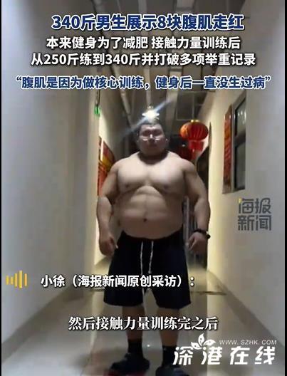 【340斤男生展示8块腹肌走红】近日,340斤的小徐凭借8块腹肌走红网络,被称为当代许褚。小徐说,本来健身为了减肥,接触力量训练后,从250斤练到340斤,并打破多项举重记录。 当340斤的壮硕身躯裹着铠甲道具亮相短视频平台,辽宁大连00后小伙小徐的“将军肚”与刀刻般的8块腹肌形成强烈视觉冲击。这位被网友戏称为“当代许褚”的肌肉巨兽,用五年时间将体重从250斤增至340斤,不仅斩获全国及亚洲健美赛事冠军,更以科学训练打破“体重与健康不可兼得”的固有认知。2025年3月,小徐在抖音发布的一条训练视频意外走红。画面中,他身着仿古铠甲完成深蹲动作,340斤的体重与清晰的腹肌线条形成强烈反差。网友评论炸锅:“这哪是许褚?分明是能单手举起青龙偃月刀的战神!”“我的腹肌还在迷路,他的已经组队出道了!”这位2003年出生的健身爱好者,五年前还是个为减肥发愁的少年。“最初只想瘦下来,结果接触力量训练后彻底改观。”小徐的健身轨迹堪称“非典型”:从250斤减重至180斤后,他开始系统性增肌,最终将体重稳定在340斤区间。这种“反向操作”背后,是每天6餐、5500大卡摄入的精准营养管理,以及每组动作90秒的肌肉微损伤修复训练法。传统运动生理学认为,男性体脂率需低于15%才能显现腹肌轮廓。但小徐的案例揭示特殊现象:其腹直肌厚度达3.8厘米,配合长期大重量训练增强的腹部筋膜延展性,使肌肉在25%体脂率下仍能呈现“浮雕式”肌理。更惊人的是他罕见的快慢肌纤维比例(7:3),这种天赋使其肌肉合成能力远超常人。