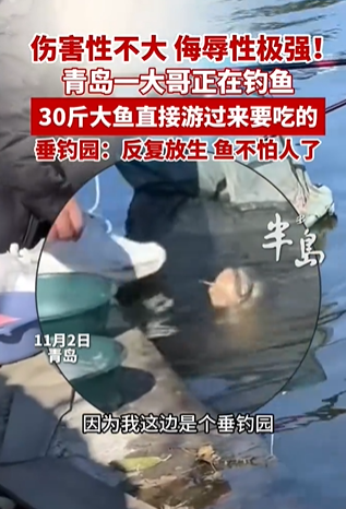【大哥正钓鱼 30斤大鱼游过来要吃的】11月2日,山东青岛,一条“30斤大鱼直接向钓鱼大哥要吃的”的视频引发网友热议。视频中,大鱼游向岸边正在钓鱼的大哥,张嘴等投喂,大哥亦是十分配合,把饵食投喂给大鱼后,便又抛下钓竿进行垂钓。当事人表示,“我这边是个垂钓园,有个规定是10斤以上的大鱼即使钓上岸也不能带走,但可以按斤来购买,因为钓了就放导致鱼也不怕人,再加上我频繁垂钓,久而久之,这条鱼便与我熟络起来。如今,一旦有人前来钓鱼,它便会主动游来,讨要食物。视频里出现的这条鱼,体重约莫有30斤。”此言一出,网友们纷纷开启调侃模式:“这位大哥钓鱼,已然修炼至登峰造极之境——但凡主动游向岸边‘自首’的鱼,他是统统拒之门外!”除此之外,“钓鱼邪修”这一独具匠心、别出机杼的称谓,犹如一颗投入平静湖面的石子,瞬间激起层层涟漪,成功在网络世界引发了网友们的热烈讨论与广泛关注。想象这样一幅画面:当狂风裹挟着暴雨,如猛兽般肆虐天地,天地间一片混沌之际,一位钓友却宛如一座巍峨的泰山,稳稳地坐在堤岸之上。他神色从容不迫,动作娴熟地收起鱼竿,一条足有三斤重的海鲈鱼被成功钓出水面,在风雨中闪耀着银亮的光泽。他一边手法利落地摘着鱼钩,一边兴奋得满脸通红,扯着嗓子大喊:“怎么样,我就说了吧!台风天才是钓大鱼的黄金时段,是上大鱼的绝佳契机!”