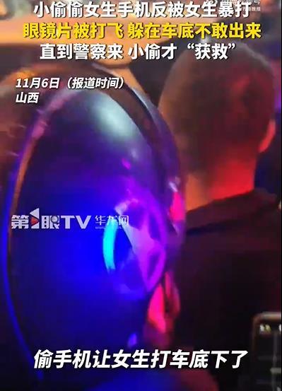 【小偷偷手机反被女生暴打半个多小时】11月6日,山西。小偷偷女生手机反被女生暴打半个多小时,眼镜片被打飞,躲在车底不敢出来。直到警察赶来,小偷才“获救”。在此提醒,遇到小偷要冷静处置,切勿过激对抗,应及时报警交由警方处理。这起事件经网络传播后引发热议,网友纷纷为女生的果敢点赞,同时也引发关于正当防卫与法律边界的深度讨论。据现场目击者描述,当日下午3时许,一名年轻女生在商业街行走时突然感觉口袋一轻,转头发现一名穿黑色外套的男子正攥着她的手机加速逃离。女生反应极快,一个箭步冲上前揪住男子衣领,对方试图挣脱却被她反手锁喉按倒在地。“那姑娘下手又快又狠,第一拳就打飞了小偷的眼镜。”目击者王女士回忆,男子挣扎中试图掏出口袋里的折叠刀,却被女生一脚踢飞。双方扭打过程中,男子多次试图逃跑,均被女生拽回,最终被逼至路边一辆SUV车底,蜷缩着不敢动弹。女生站在车外怒斥:“偷东西还有理了?出来!”引得围观群众阵阵喝彩。这场“单方面压制”持续约30分钟后,有路人报警。民警赶到现场时,发现男子仍躲在车底瑟瑟发抖,女生则站在一旁情绪激动。为避免事态升级,民警蹲下身轻声劝说:“出来吧,我们依法处理,不会让你受委屈。”经过10分钟安抚,男子才哆哆嗦嗦爬出车底,被戴上手铐时竟如释重负般长叹一口气。“他眼镜碎了,脸上还有抓痕,但明显女生伤得更重。”出警民警透露,女生右手关节红肿,衣袖被扯破,但拒绝前往医院,坚持要当场指认嫌疑人。经查,该男子系惯犯,曾因盗窃被行政拘留三次,此次作案工具折叠刀也被当场缴获。事件视频在网络疯传后,#女侠威武#、#偷鸡不成蚀把米#等话题冲上热搜。多数网友为女生的果敢点赞:“遇到这种事就该以暴制暴!”“小偷活该被教训!”但也有法律人士提醒:“女生行为可能涉嫌防卫过当。”