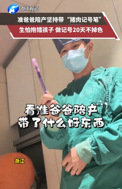 【男子带猪肉记号笔陪产怕孩子抱错】一支用来标记猪肉的笔,却成了浙江一位准爸爸产房里的 “安心利器”—— 他害怕新生儿被抱错,坚持要带上这种能 20 天不掉色的笔给娃做记号。近日,浙江一位准爸爸带着一支猪肉记号笔进入产房陪产,只为在孩子出生后第一时间做上独一无二的标记,防止抱错。在这段引发热议的视频中,这位浙江的准爸爸准备充分,带着一支特殊的笔走进产房 —— 猪肉记号笔。这种笔原本常用于生鲜食品标记,因其不易褪色的特性,被这位细心爸爸选为宝宝的身份标识工具。他坚定地向医护人员表示,要在孩子出生后立即做上记号,还自信满满地强调这种笔的痕迹 20 天都不会掉色。
