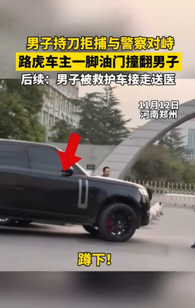 【男子持刀拒捕被路虎车一脚油门撞翻】“把刀放下!” 民警的警告在郑州街头回荡,但持刀男子并未听从。就在这紧张时刻,一辆黑色路虎越野车突然加速,精准撞向持刀男子。网友拍下的视频显示,持刀男子被撞倒在地后,现场民警迅速上前将其制服。这惊险一幕发生在河南省郑州市某银行研修中心门前。13 日,郑州市公安局金水分局北林路派出所工作人员回应称,被撞男子无生命危险,已送医救治。